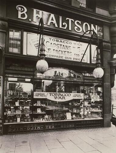 Shop window display for B H Altson Pty ltd Tobacconists. The sign 'Tobacco War' is in the window. This photograph shows the window display of B H Altson Pty ltd Tobacconists, Melbourne, circa 1950. 'BH' stands for the owner's initials, Barnett Hyman. 'BH' as he was known by his family, came to Australia in 1870 from Yorkshire. He set up the tobacconist on the corner of 300 Collins & Elizabeth Street. This shop was referred to as 'No 1 Melbourne', because it was originally owned by John Batman and was then later bought by Altson. According to the family, it was 'the first brick building in Melbourne, and a major meeting place in 'BH's' grandson David Altson's generation. 'I'll meet you at Altsons' Corner' was a popular saying. According to David, it was 'a very masculine shop, but older ladies would sometimes come in to buy cigars, or snuff for themselves.'