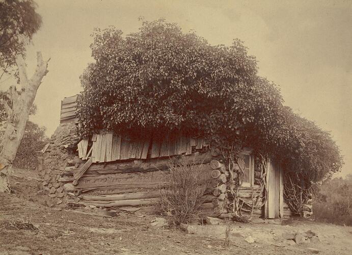 Old 'log cabin' house, with tree growing up over the roof. This photograph shows a 'log cabin' house, with a tree growing up over the roof. The photograph was apparently taken in Warrandyte, the date is unknown but is estimated at circa 1890s. The contributor collects antique images. He is unsure how this one came to be in his possession, possibly from a demolition site. This and image MM110729 are from the same source.