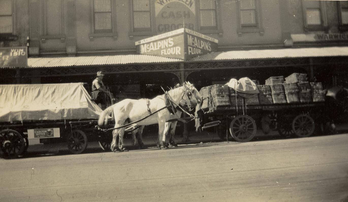 Delivery of goods to 'WW Allen Cash Grocers', located in a large verandah covered building. There are two large carts drawn by horses outside on the street. The cart to the viewer's right is stacked with large cane baskets, with white sheeting lying over part of the cart. The cart to left is entirely covered with white sheeting. The shop has a large McAlpins Flour advertising sign at the centre of the store, above the verandah.