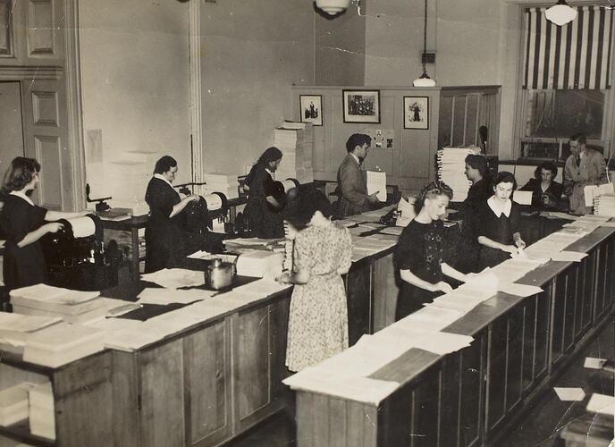 Office workers behind a row of desks, in the Duplicating Department, Victorian Railways Office, during World War II, between 1943 and 1944. Heather Allen is in the background, third from left. She was employed with Victorian Railways from 1939-1948.