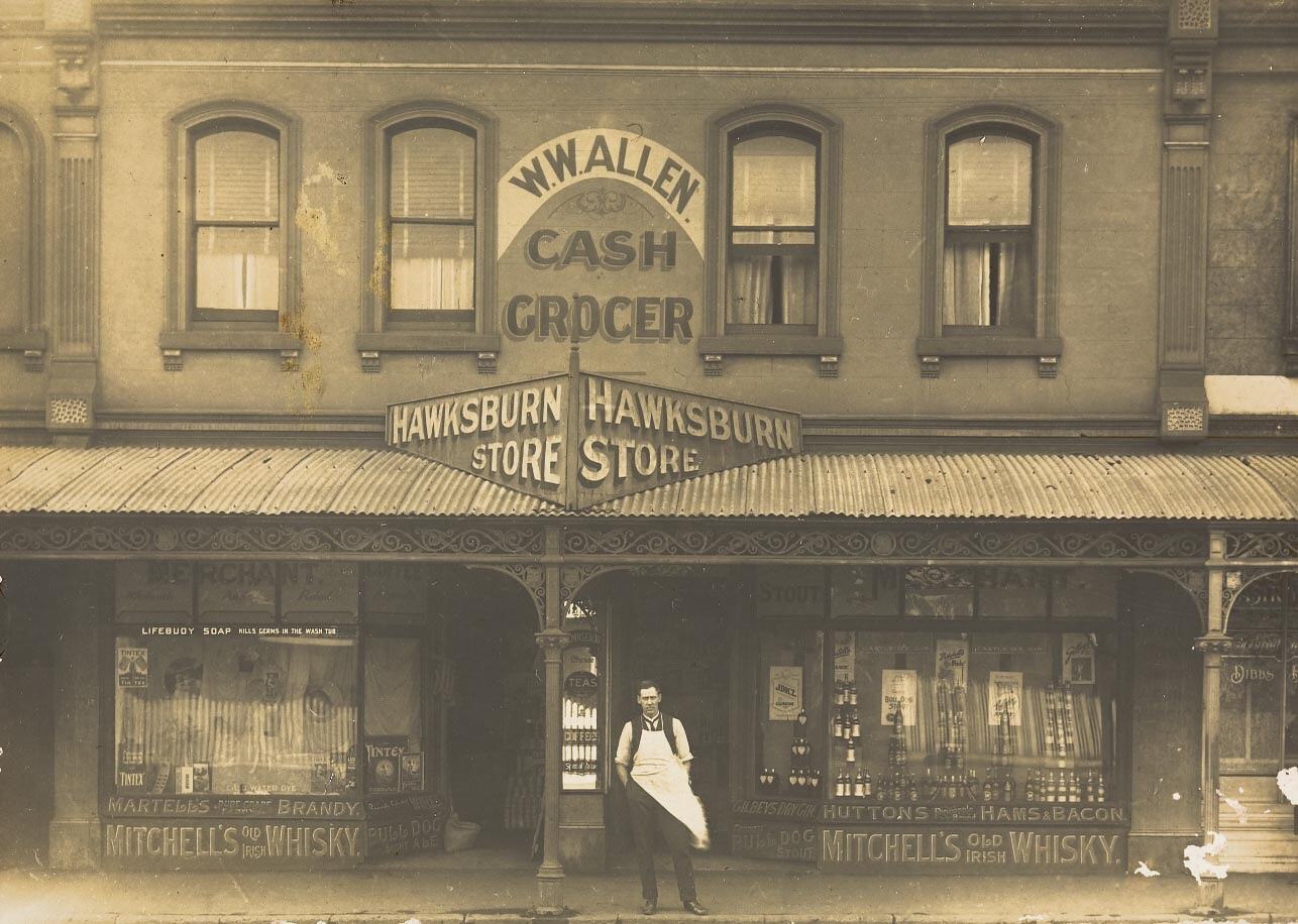 Shop assistant in trousers, waist coat, shirt and apron, standing outside his Grocery Store. The wind is blowing his apron. This photograph shows shop assistant Jack Moore standing out the front of grocery store WW Allens Cash Grocers. The shop was owned by Jack's brother-in-law, Walter Allen. The photograph was taken just after the family opened the shop in Hawksburn, 1920.