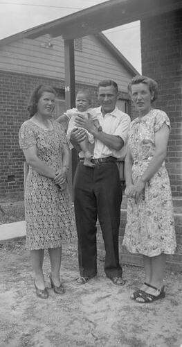 Two women standing on either side of a man carrying a baby, outside a new house. This photograph shows members of the Duncan and Beedles family, standing outside the Duncan's house in West Heidelberg, Christmas day, 1950. Left to right: Frances Duncan and her George Duncan, who is carrying his son Alec, and Anne Beedles. Anne was Frances' sister. The photographer Russell Beedles remembers 'The Duncans lived up the road in a new Housing Commission of Victoria house in West Heidelberg. They were thrilled to get the house. The family were new migrants, and had stayed with the Beedles at Waterdale Road for a year. The Beedles sponsored the Duncan family to emigrate. Anne put their names down on the waiting list and they were accepted.' The Beedles had come to visit and have Christmas lunch with the Duncans. The photograph was taken with the 'Box Brownie'. 'It got taken everywhere.'