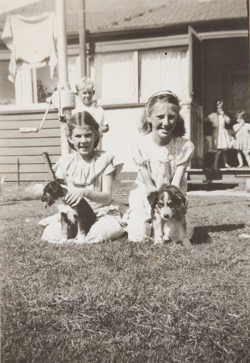 Two girls with their puppies in the backyard. This photograph shows Helen Herbert with her new puppy Frisky, and her best friend Marion Markin, who also had a new puppy, 1948. Marion lived opposite Helen in Whitmuir Road Bentleigh. There is an unknown boy behind them. In the background are Helen's sisters, Bernadette and Marie. This photograph was taken in the Herbert backyard, in Bentleigh.