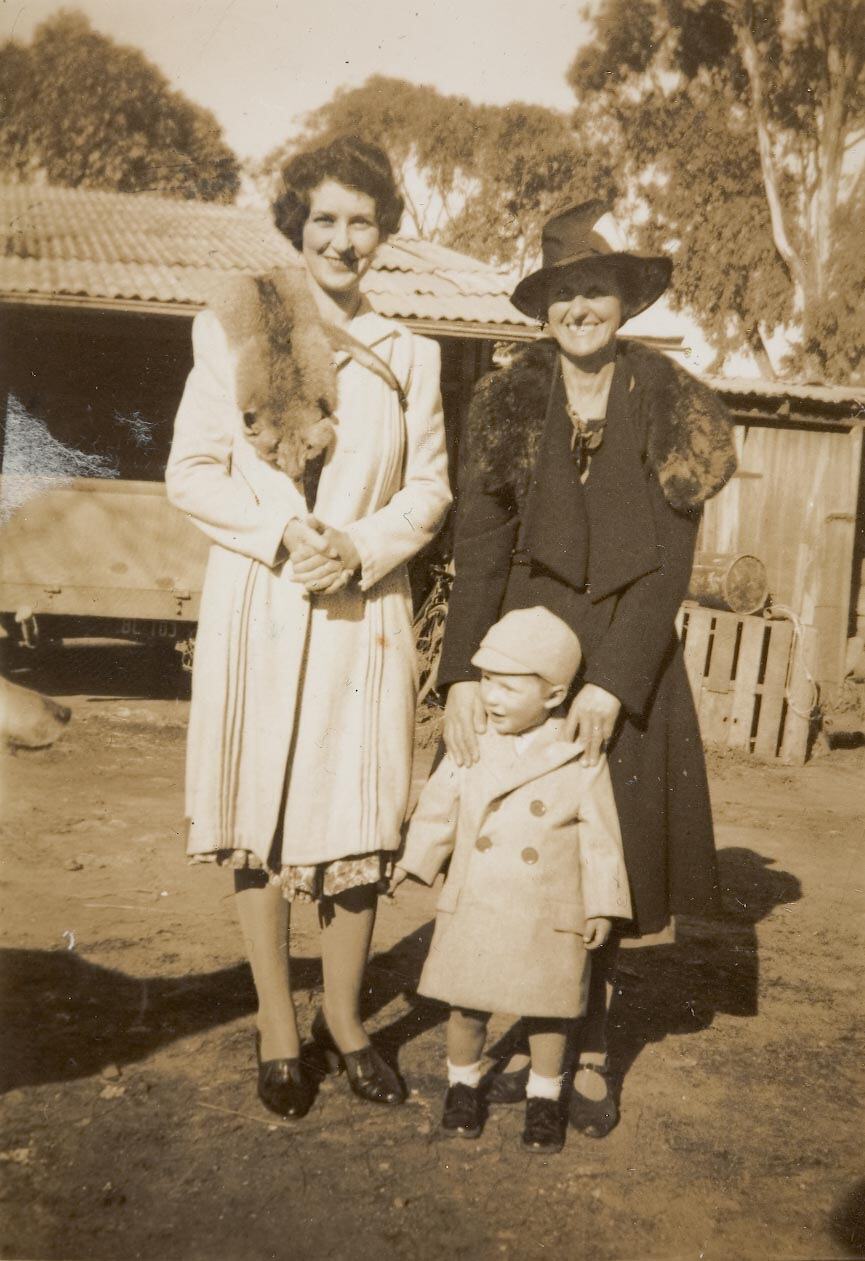 Two women standing with a small boy, dressed for an outing. The boy is wearing a cap, and the women are wearing fur stoles and hats. In this photograph, Winifred Frith and Ann Barnes are dressed up for a rare trip into town, Blackburn, 1943. They lived and worked on the family poultry farm on Blackburn Road, Blackburn. During World War II, petrol was rationed, so when going into town they would take the horse and trap to Box Hill and would stable the horse and then they would take the steam train into Flinders Street. Ann, the woman on the right would always wear an old tattered hat for the trip because when she visited her brother at Banana Alley he would declare 'Oh Ann, you can't be seen in town like that, here's some money go and buy a new hat.' It is family lore that this brother ran an illegal agency, an 'SP book', out of his shop/factory in Banana Alley.