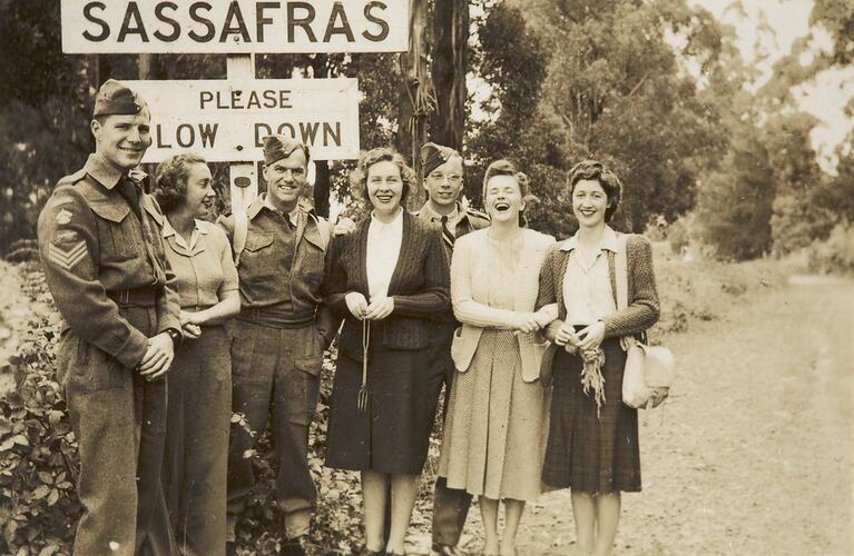 Sybil Oakes was a servicewoman during the war, working as a radar mechanic in the Army. She was stationed all around Greater Melbourne, Victoria and NSW. She and her friends entertained these Canadian servicemen, by taking them to the Dandenongs by train for a picnic. Few people had cars, so crowds of people got off the train at Belgrave and walked into the hills, hiking for several hours before having a picnic. Sybil and her friends were able to wear civilian clothes and dressed up for the picnic, but the servicemen remained in uniform. Sybil's story of her experiences in World War II is in the Australian War Memorial archives.