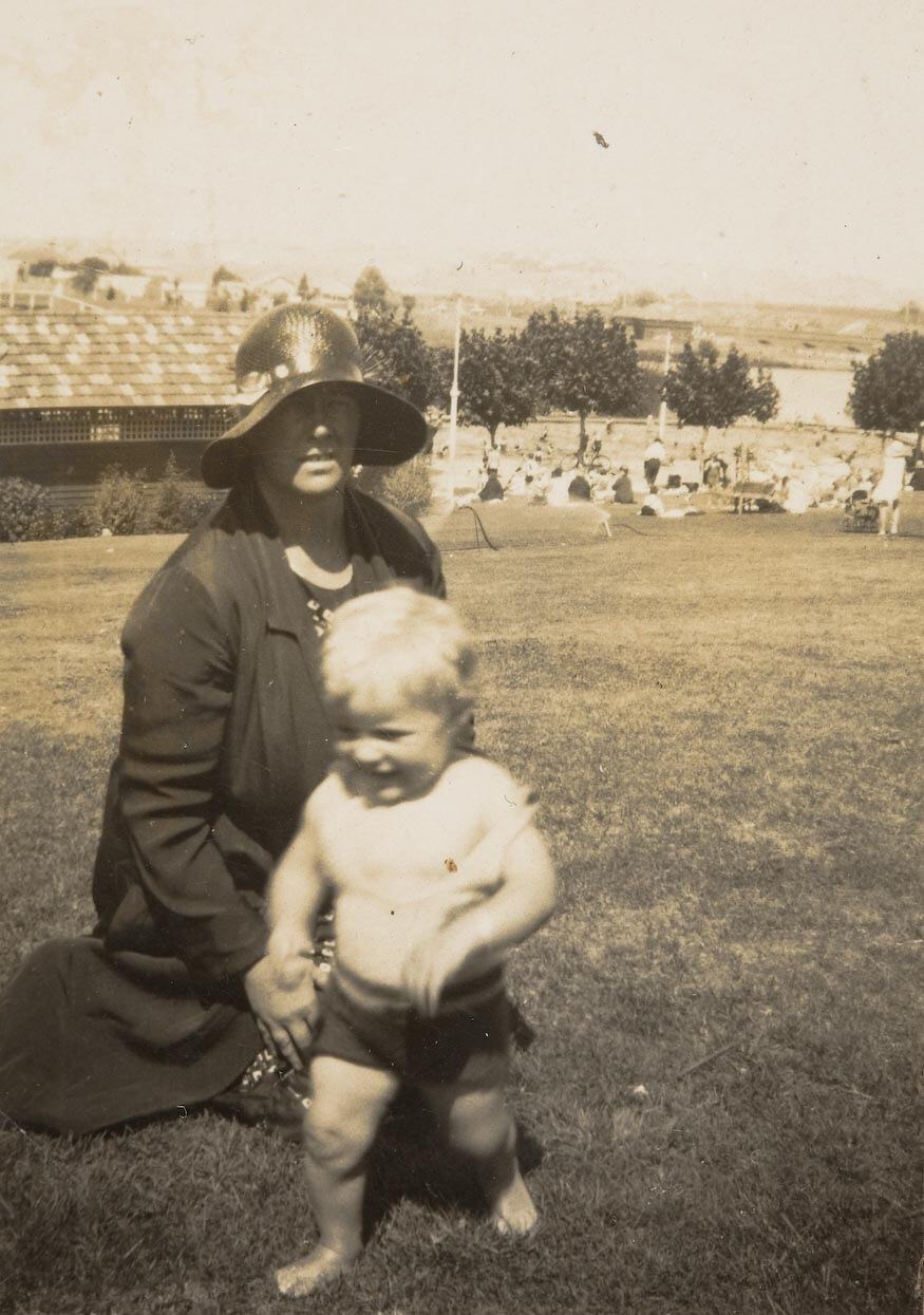 Woman kneeling on grass in sun hat, with baby in singlet and shorts toddling in front of her. There are other sun-bathers sitting around the lake behind them in the distance. This photograph shows Hilda and Eileen Buckley, enjoying a day out at Coburg Lake, 1932. Hilda Buckley is kneeling down, and her daughter Eileen Buckley is in front of her.
