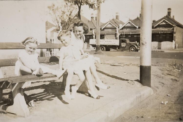 Mother, boy and girl sitting in a public seat on a footpath. The girl has a bow in her hair and appears to be doing up her shoe. A row of houses is in the background, with a delivery truck parked in front of them.