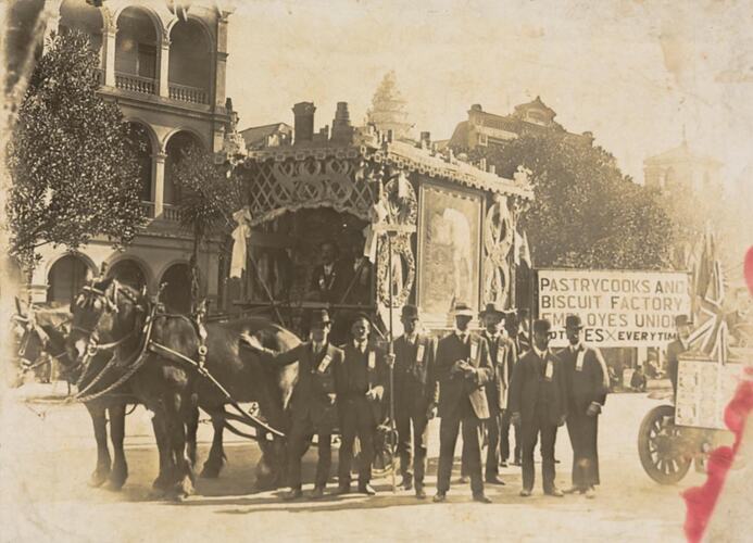 According to the Archer family, Dick Archer had to work on Saturdays as well as weekdays at the Swallow and Ariell Biscuit Factory. His children were young at this time. Other members of the Archer family also worked at the factory, including Jack Archer who lived at Coburg who, on some occasions, marched in front of the float with a baton. The Archer family remembers that 'The Swallow & Ariell staff marched with the Pastry Cooks and Biscuit Factory Cooks Union.' The sign in the photograph states that the union name is actually the Pastry Cooks and Biscuit Factory Employees Union. This union can be traced back to the first industrial organisation in Victoria which was for pastry cooks. It later changed its name several times due to merging with other related trades such as flour and sugar goods workers.