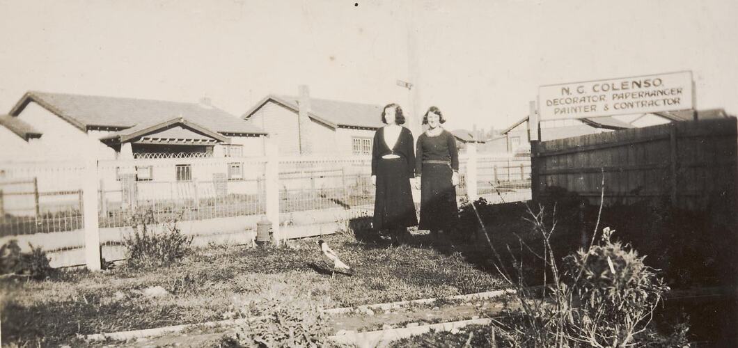 Two girls in dresses, standing on the lawn of a front garden. There is a magpie in front of them on the lawn. This photograph shows Muriel and Edythe Watson in Derby Street Balwyn, circa 1935. According to the family: 'This was one of the rental properties the Watson family lived in, 10 years after the family's arrival from England. Edythe would have been about 20 years old. Mary their mother probably took the photograph, as she had a Box Brownie camera.'