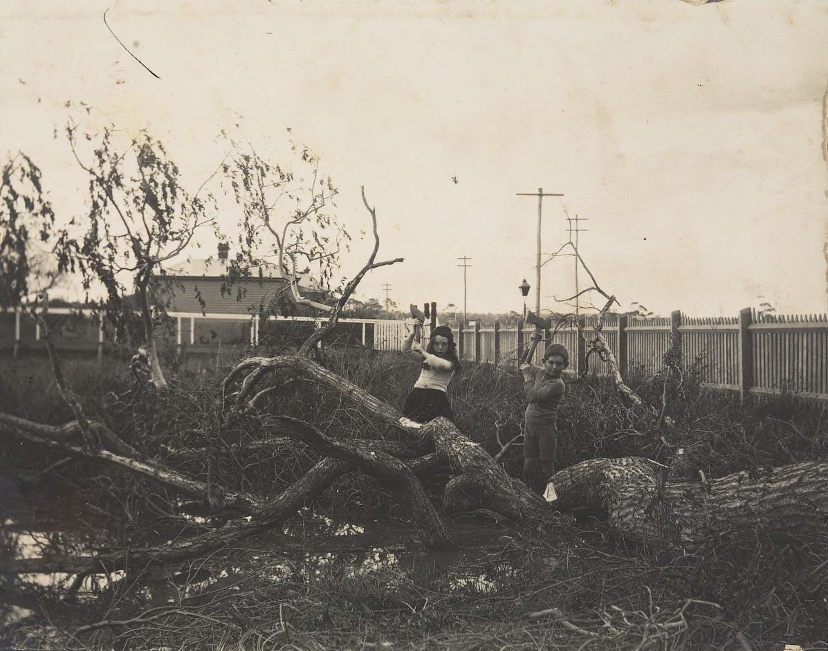This photograph shows Bebe O'Connor and Geoffrey Pern chopping up a fallen tree at 'Trenton Valley', Won Wron, Gippsland, circa 1912.