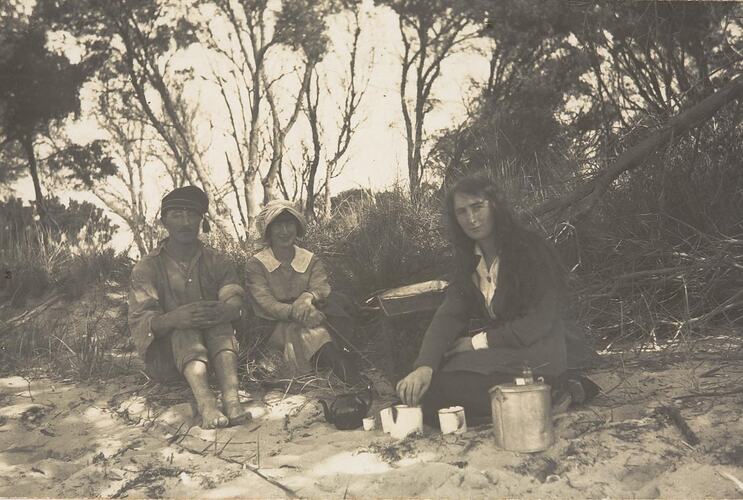 This photograph shows Gray O'Connor, making tea for her friends on a picnic in Boat Harbour, Gippsland, in April 1919.