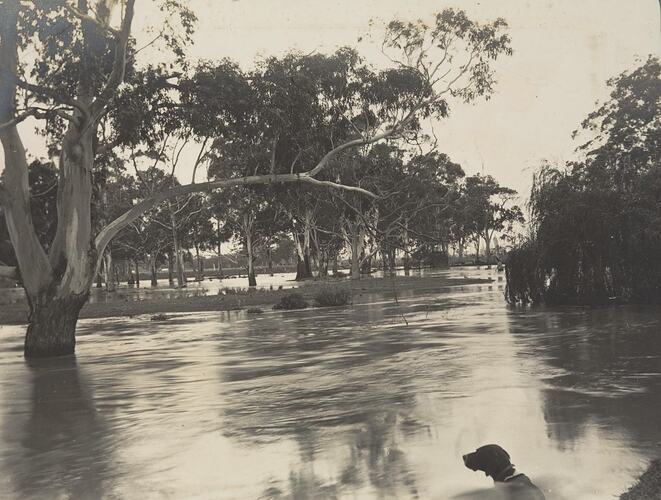 This photograph shows Bodman Creek in Won Wron, Gippsland, swollen from a flood, circa 1912. A dog is in the foreground.