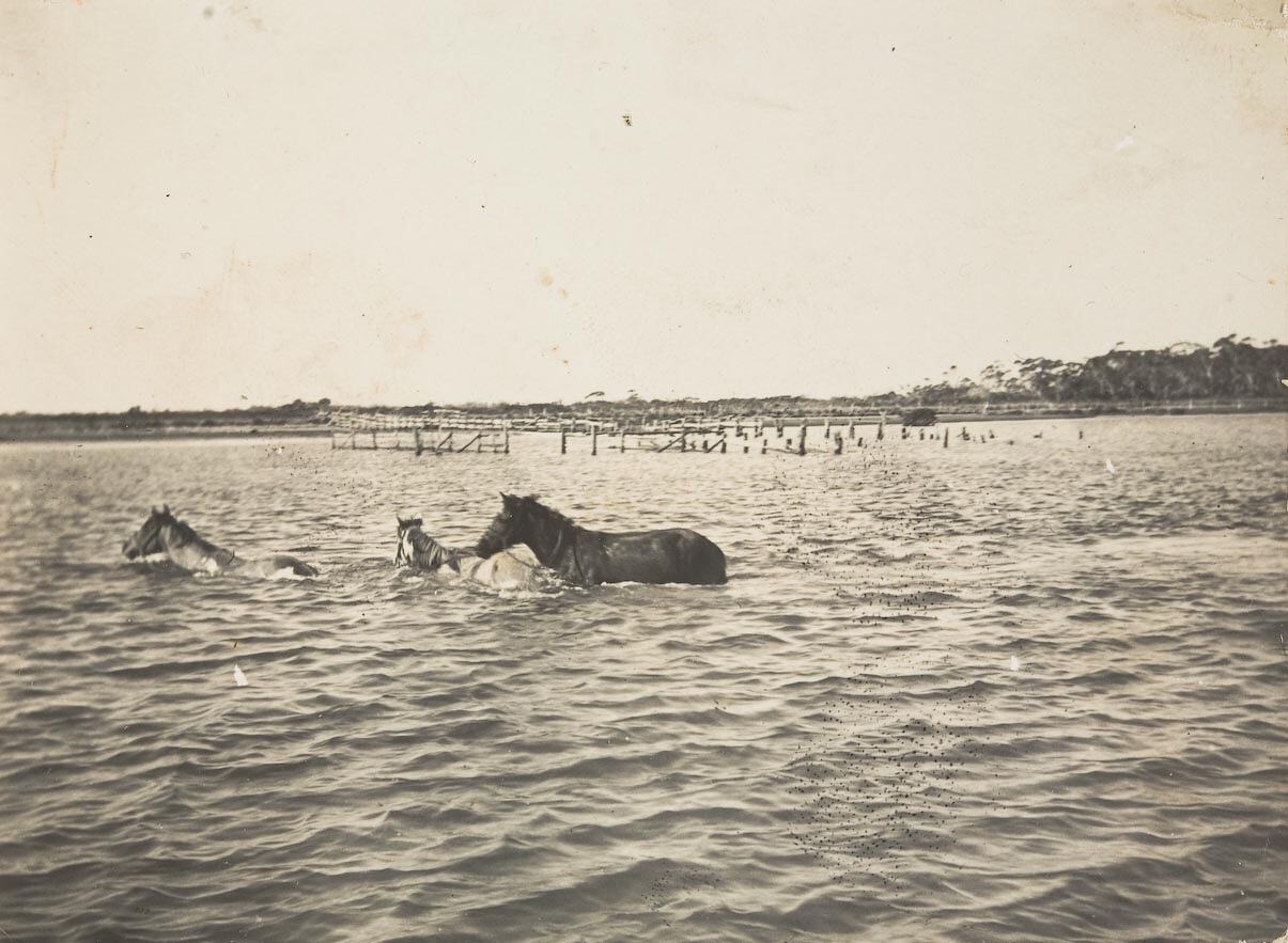 This photograph shows how John Joseph 'JJ' O'Connor and Dr. Pern would get horses across to St Margaret Island from the mainland, circa 1910. When the tide was low it was possible to walk the sheep across but once the tide rose they would swim the cattle and horses across. The O'Connor family leased the island for a period of time in the early 20th century to graze their cattle in the summer. There was only one shack on the island, however the O'Connors would invite friends and family to visit over the summer to camp.