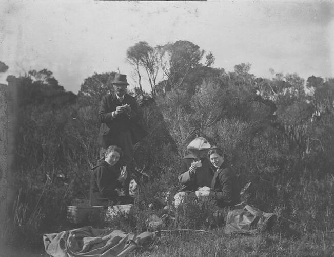 This photograph shows Dr. Sewell, John Joseph 'JJ' O'Connor, Georgina Gertrude O'Connor, Harold O'Connor, Gray O'Connor and Mollie Bodman on a picnic at St Margaret Island, 1920s.