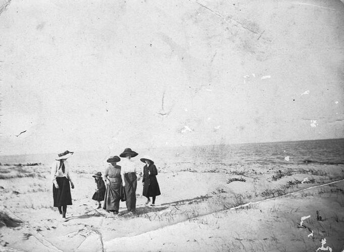 This photograph shows a group of unknown women and girls, walking on Ninety Mile Beach, circa 1910.