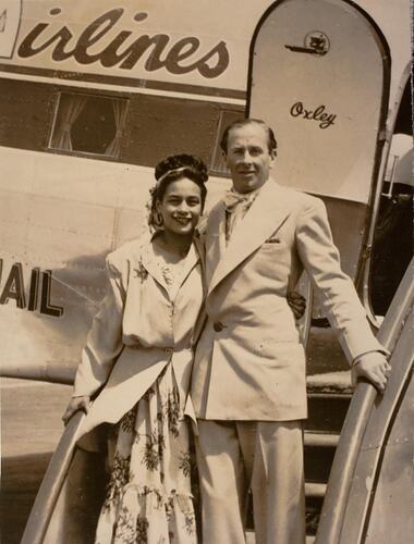 Man in suit and woman in dress and jacket, standing on the stair of a Douglas DC-3 aircraft, ready to board. This photograph shows Patricia and Henrick Von Sonnewald about to board a plane to Tasmania from Essendon Airport, 1948. His widow Patricia remembers: 'Henrick had fled Germany before World War II, dismayed by the Nazi movement. He arrived in Australia to represent his uncle's precision machine factory on the eve of World War II and was promptly interned at Tatura for the next five years. By the time of this photograph, Henrick had built an Australia wide business, a year after his release from Tatura. He had a tie manufacturing business, and he and Patricia would travel all around Australia to different department stores. He had come out of Tatura very poor, as all of his goods had been confiscated. But he noticed that there were very few good ties available in Australia. He was very fashion conscious and decided to start his own business.' The DC-3 (VH-TAI) they are boarding belonged to Trans Australia Airlines and was named 'Oxley' following the policy of the airline to name their aircraft after noted explorers. This photograph was taken by an unknown friend with Henrick's camera.