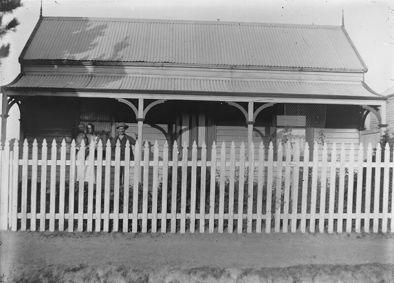 Man, woman holding baby standing in front of a weatherboard house. This photograph shows the Bartletts (names unknown) standing outside their family home on Spring Street, Preston, circa 1902. The Bartletts moved in about 1874 with their children. According to the family, 'They were migrating from New Zealand to England, but didn't make it there.' Mary Bartlett married William H Luly.