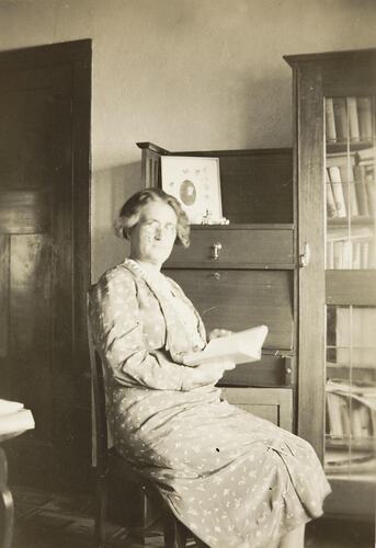 Woman sitting holding an open book, in front of a wooden desk with lead-light cupboard. This photograph is a portrait of Mrs Nell 'Nellie' Bunting, in her parlour in Drummond Street Oakleigh, 1924. The photograph shows 'Nellie' Bunting, seated by her desk and lead light bookshelf. It was taken by Robert Bunting, her son, when about 9 or 10. According to his daughter Janet: 'He woke up on Christmas morning to discover a Box Brownie Camera next to his bed and took a photograph each of his father and mother right away. They had to sit still for 25 seconds, and Robert remembers his father got very restless.' The desk and book case were also made by his father, Janet believes that the parlour was a room for special occasions. 'People didn't use their parlours as much as people now use lounge rooms.'