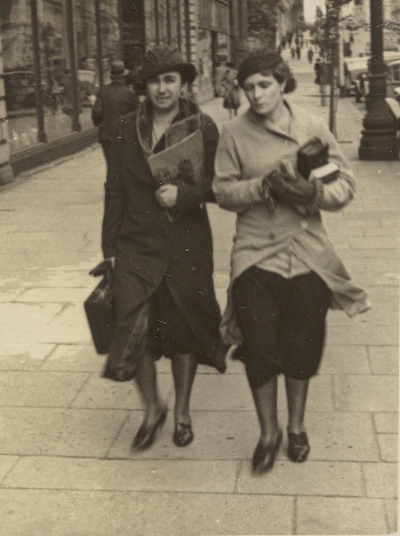 Two women in coats and hats walking down paved footpath in Melbourne, One is carrying a small case and the other is carrying a book and purse. This photograph shows Joyce Smith and friend, walking in Collins Street, Melbourne, 1930-1939. According to the family: 'The photograph was taken by a street photographer. They would then give you a ticket and suggest you go to the studio to pick up the prints.' This particular print is only half of a postcard print.