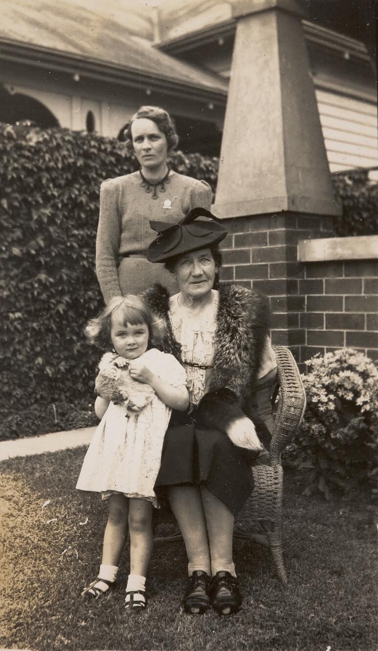 Two women and a young girl in the front garden of a house. One woman is standing, wearing a dress and a badge. Seated in front of her in a wicker chair, the other woman is wearing a fur stole over a blouse and skirt, and a hat. The young girl standing is holding on to a soft toy. The verandah of their house is visible behind them.