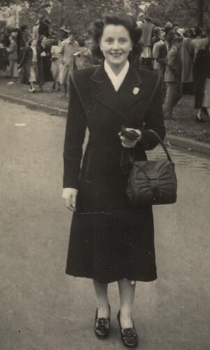 Woman in coat, carrying gloves and hat, standing on the road, after ANZAC Day March. There is a crowd of people on the footpath. This photograph shows Maureen Kean on St Kilda Road Melbourne, following the ANZAC Day March in 1947. Maureen remembers: 'Nothing was open in Melbourne on the weekend in those days, which added to the big crowds that used to attend. A street photographer took this photo, which was quite a common thing for those days.'