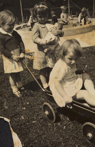 Three young girls playing with a push trolley. There are other children playing in a sand pit behind them. This photograph shows Margaret Hill and other children at the Harris Street Kindergarten, North Melbourne, 1940. For Margaret: 'It was the local kindergarten at the end of the street.'
