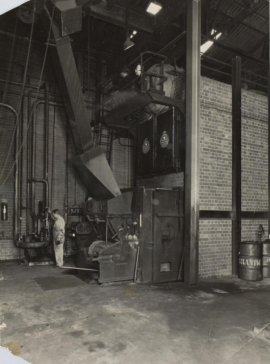 John Delaney worked as a boiler attendant for Alfred Lawrence & Co for about 25 years. He had previously been a farmer and truck driver, and came to Melbourne from Colac in 1948 for work. His family believe the boiler he worked on was a coal fired 'Babcock & Wilcock' boiler, approximately 14 feet high and 20 feet long. It was a 'wet sleeve' boiler, which meant that water flowed around the outside of the firebox to be heated. The shaft coming down from the top left corner is a coal shaft, that fed coal on to the roller, and so into the boiler. The boiler was converted to gas in about 1966.