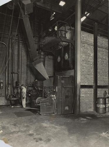 Black and white photograph featuring a view of John Delaney attending a boiler at Alfred Lawrence and Co. factory in Bruce Street Kensington, circa 1950. The Alfred Lawrence and Co. factory made food essences and food colourings, including 'Blue Ark essence'. The factory was located near Macaulay Station, in Kensington, an inner western suburb of Melbourne.