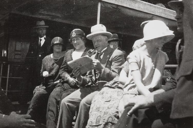 Man smoking pipe, wearing hat and reading newspaper, sitting next to smiling woman in turban on steamer ferry. Other passengers, wood panelling and tarpaulins are visible. This photograph shows passengers aboard a steamer ferry on Port Phillip Bay, circa 1920. Not much is know by the family about this photograph. Adrian Holloway and his mother Elizabeth Holloway, and probably his two sisters went on an outing on one of the Port Phillip ferries, either the 'Hygeia', 'Weeroona' or 'Ozone', probably to Sorrento, in the 1920s. The photograph shows Adrian smoking a pipe in a broad brimmed, high crowned hat, and his mother in a turban style hat with a crest on it, in the centre of the crowds on board the steamer.