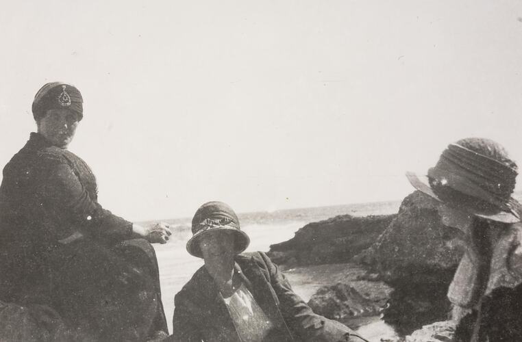 Three women in hats sitting on a rocky beach. There is a woman in a turban hat on the left. This photograph shows Elizabeth Holloway and probably her two daughters, on a rocky beach, probably at Sorrento, circa 1920. Not much is know by the family about this photograph. Adrian Holloway and his mother Elizabeth Holloway, and probably his two sisters went on an outing on one of the Port Phillip ferries, either the 'Hygeia', 'Weeroona' or 'Ozone', probably to Sorrento, in the 1920s.