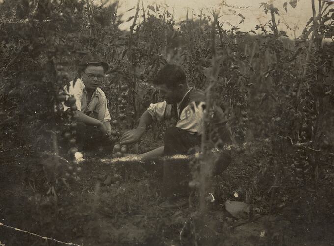 Black and white photograph showing Ivan Kucan and a friend with their tomato plants, at Bonegilla Migrant Reception and Training Centre, 1950.