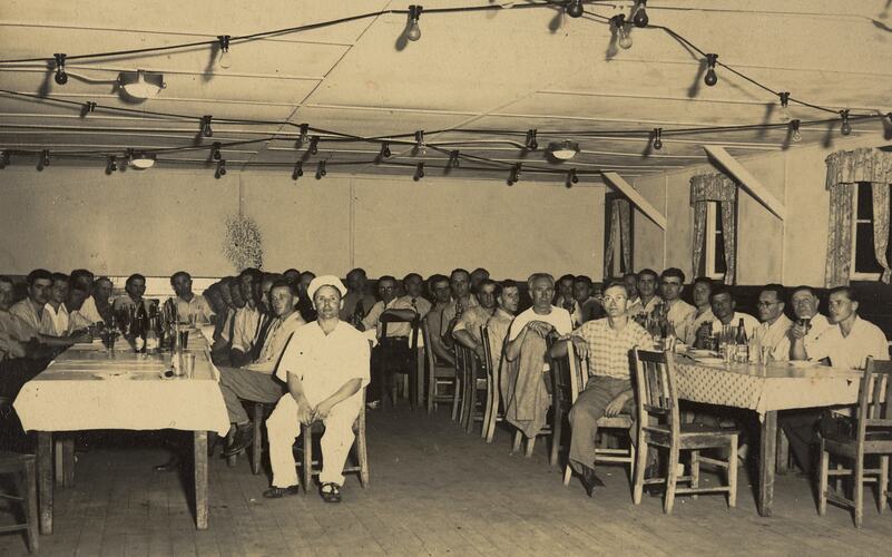 Black and white photograph showing men in the Mess Hall at Bonegilla Migrant Reception and Training Centre, 1950.