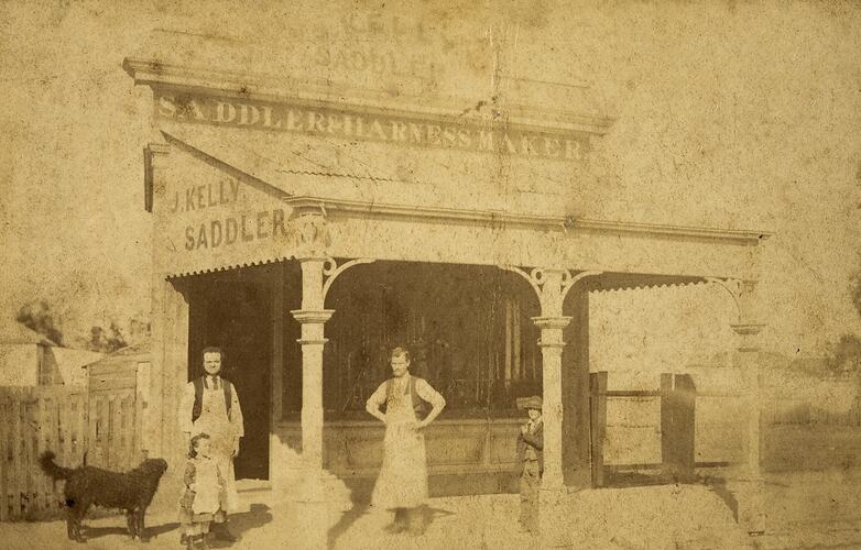 Staff photograph of owner, an infant girl, a staff member, boy and dog, outside J Kelly Saddlers and Harness Makers. This photograph shows John Kelly, one of his daughters, and a staff member outside his store J Kelly Saddlers & Harness Makers, St Kilda, in about the early 1870s. John came to Australia from Ireland with his brothers and sister Peter, Michael and Elizabeth in 1864. After three years he set up his saddlery business in St Kilda. He ran the business until he died on Christmas Day 1900. The business kept going until 2000 when his grandson Matthew Kelly jnr. died. He had made harnesses for the Clydesdales for Carlton & United Breweries. The photograph shows the yards beside the shop, and also a dog and a boy, who may be related to the store, or a passer-by. This is the second view of this property. The sequence showing the store's development goes: MM111056, MM111058 and MM111057.