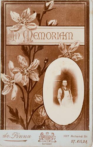 Memorial card of John Kelly, showing portrait, flowers and text, 'In Memoriam'. This is a memorial card for John Kelly, who died on Christmas Day, 1900. He was a resident of St Kilda for 33 years, running a saddlery business. John Kelly came to Australia from Ireland with his brothers and sister Peter, Michael and Elizabeth in 1864. After three years he set up his saddlery business in St Kilda. He ran the business until he died. The business kept going until 2000 when his grandson Matthew Kelly jnr. died. He had made harnesses for the Clydesdales for Carlton & United Breweries.