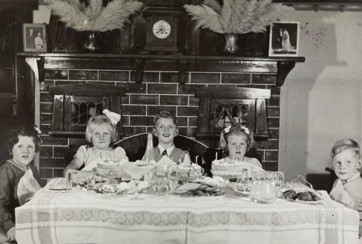 Nola Russell, Lorraine Fly, John Richardson, Margaret Fly and Noel Miller at a birthday party, Caulfield, November 1946. The children are celebrating the shared birthday of sisters Lorraine and Margaret, and their cousin John. Only the cousins and a friend and a neighbour were invited. The three children often celebrated their birthdays together. None of them can now recall much about that particular birthday.