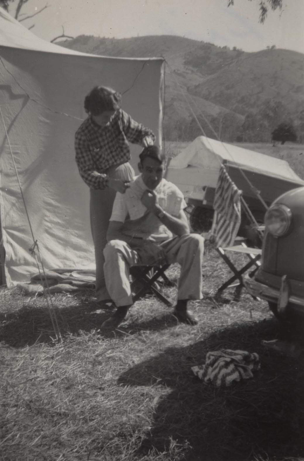 This photograph shows Ivy Russell cutting her husband Frank's hair while camping at McAlister River, Licola, 1951. The Russell family would go away to a different spot each year with other family members over the Christmas Holidays.