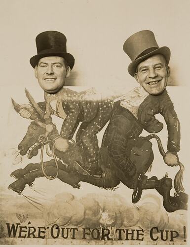 Studio portrait of two men in a novelty 'racing' photograph, Luna Park. This novelty 'racing' photograph of Joseph Doolan (right) and his friend Tommy Spencer, was taken at Luna Park, St Kilda, circa 1937. According to Joseph Doolan's son, 'Tommy Spencer was a bit of a racing fan, and this photograph may have been taken at the time of the Melbourne Cup.'