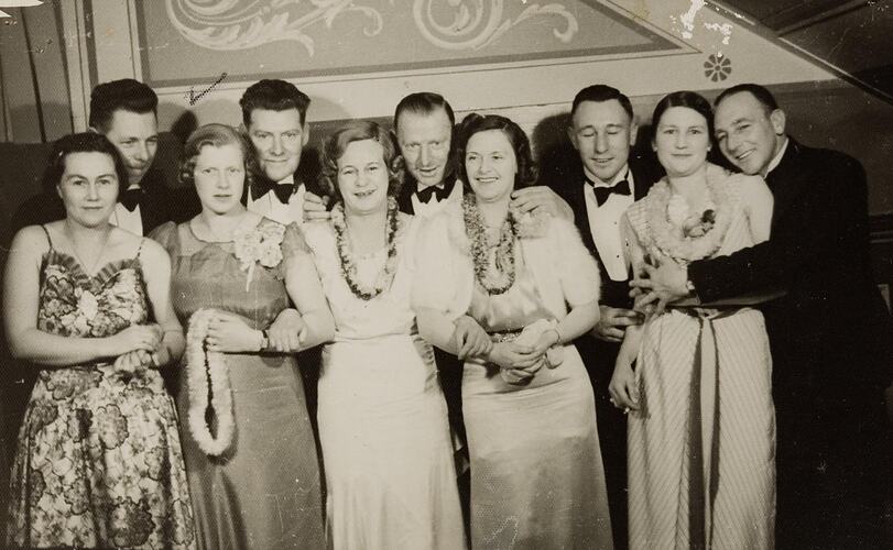 Group of five women and five men dressed for a dance and wearing Hawaiian leis. This photograph shows Jean Holden and her fiance Joseph Doolan with their friends, dressed for a dance, Melbourne, circa 1934 - 1935. According to their son, 'They used to go dancing on Saturday nights.' It was taken by a street photographer.