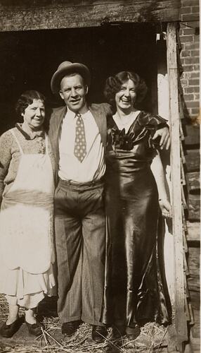Woman and man dressed in evening wear, pose with mother by stable door. This photograph shows Emma Doolan, her daughter Winifred Doolan and family friend Tommy Spencer and Winifred Doolan at a stable, circa 1930. The family believes ''Winnie' and Tommy look as though they are ready to go out for the evening.'