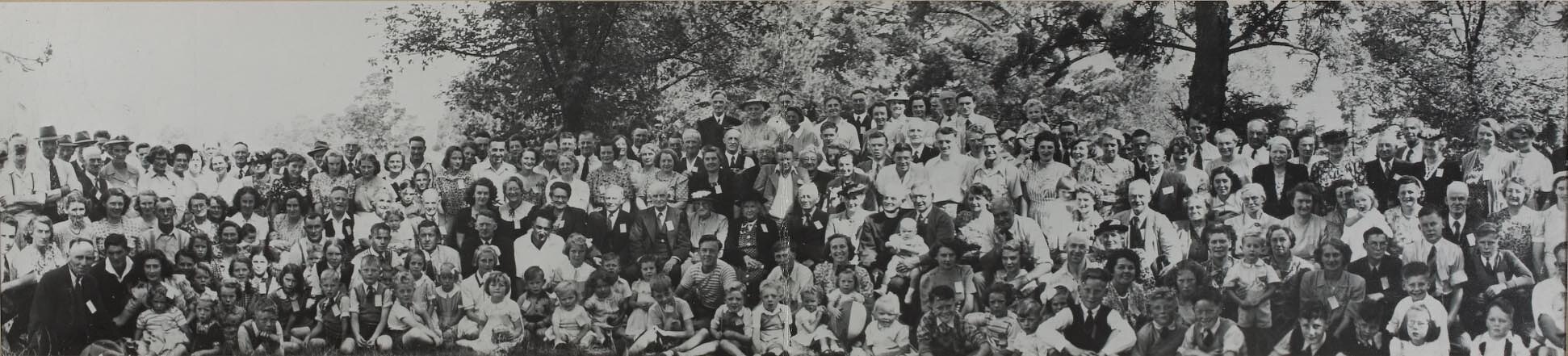 Group portrait of a family gathering of over one hundred people. This group photograph was taken at the Newnham 'clan gathering', in Heidelberg, in December 1949. There were more than 100 Newnham family members. The photograph and an article were published in the Australasian Post, December 15, 1949. According to the family, 'Fred and William Newnham immigrated to Melbourne in 1849, from Wivelsfield, England. They arrived on the 'Harpley' after a journey of 122 days. They were sponsored by the Baptist Church, Brighton, England. Both men went on to have 14 children each.' The photograph depicts descendants of these brothers, who met at an annual picnic in Heidelberg Park in 1949. The descendants started meeting annually in 1937, and still do. The most recent gathering at the time the image was collected by Museum Victoria, was in March 2006.