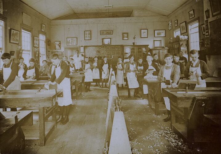 View of classroom and wood-work class at Brunswick State School. The boys are all wearing aprons. This photograph shows an 'Educational Sloyd' woodwork class at Central Brunswick State School, 1915. Ronald Alfred Cheers is the first boy on the right of the photograph, aged about 12. 'Sloyd' was a special kind of teaching technique, where students would learn general skills like manual dexterity and discipline through crafts such as woodwork.