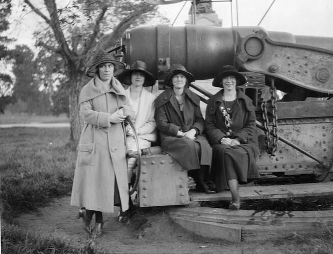 Four women in heavy coats and hats sitting on machinery that is half sunk into the ground and heavily riveted. This photograph shows four women, Nell, Jess, Sus and Elsie, dressed for an outing in Geelong, 2 September 1922. Their surnames and the precise location are unknown.