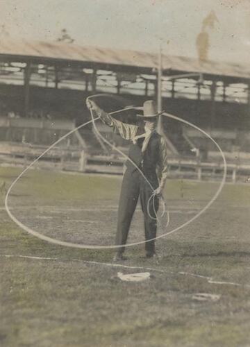 A man in a 'cow-boy' hat spinning a lasso in Showgrounds, with a roofed audience 'grand-stand' behind him. The photograph is hand-tinted. This photograph shows Ernie Holden, rope spinning at the Royal Show Grounds, Ascot Vale, circa 1910. His daughter Melba Ryan remembers: 'At Show time, Ernie was always engaged to perform in the main arena. Living in Kensington, it was only walking distance to the Show Grounds. Ernest Holden's show name was 'Ernie Gordon'. A well-known South African group of flyers came over to Australia, called the Flying Jordons. Ernest liked the name and changed it slightly.'