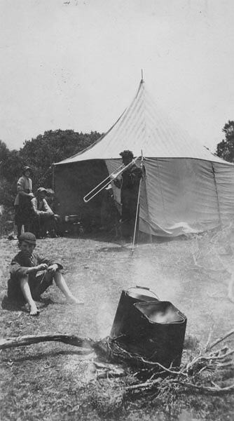 Man plays trombone by tent, while man and women sit nearby. Boy sits by camp-fire in fore-ground. This photograph shows Adolphus 'Dolph' Holden' jnr of Holden Brothers Circus, practicing on the trombone, while Eileen and Stan Holden sit nearby, about 1900 - 1910. His niece Melba Ryan remembers: While Stan didn't work with the circus, he and his family often visited on holidays. 'Lenny' Leonard Holden as a boy is sitting by the fire. This photograph was taken outside the 'tucker tent'. 'Nan' (Florence Holden, Melba's grandmother) would do most of the cooking on the fire. The tent hands, other staff and Stan and Eileen would eat at the tucker tent. Water was heated for cups of tea, washing etc in kerosene tins. You took water from wherever you could get it, and put it on the open fire to boil. Nothing got thrown away. You would clean the kerosene tin out, cut a hole in the top, put handles on the sides and you had a cooking pot.' The location is unknown.
