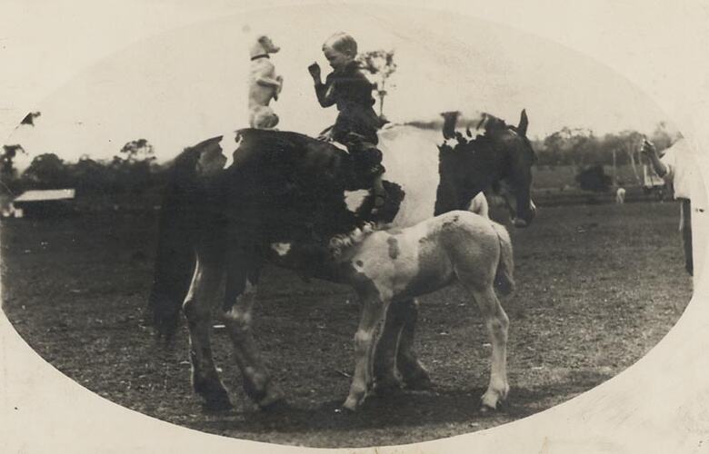 A boy sits backwards on a pony with a dog, while the pony's foal has a drink. This photograph shows Freddy Mayanard of Holden Brothers Circus, circa 1935. He is sitting backwards on a pony with a dog, while the pony's foal has a drink. Melba Ryan remembers: 'She and other kids would often be educated by correspondence while travelling, and Mrs Mayanard would get the kids of the circus together and be teacher. Sometimes the kids would have to stay home to learn. Freddy is now the proprietor of Perry's Circus. His whole family travelled with the Holdens at one stage. Freddy was taught by Ernie to spin ropes, and he became very accomplished.' The location is unknown.