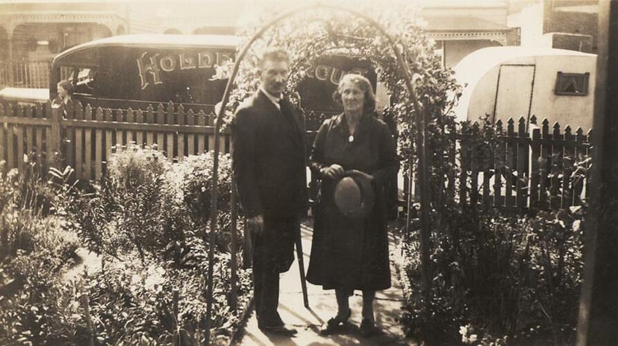 A man and woman underneath an arch of flowers at a front gate of a suburban home. This photograph shows Adolphus and Florence Holden at the gate of their family home in Kensington, early 1930s. Their house was the winter base for Holden Brothers Circus. Their granddaughter remembers: 'They used to come home for the winter months, usually 2 or 3 months when the roads were difficult to travel on and people didn't want to come out and see shows in the cold.' One of the Holden Circus trucks and a caravan is behind them.