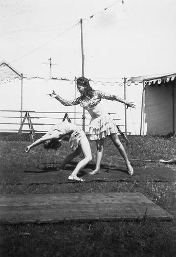 Two girls practicing tumbling on a mat in the open, with 'Big Top' behind them. This photograph shows Melba Holden (right) and Audrey Holden (bending backwards) of Holden Brothers Circus. They are practicing a tumbling routine in costume, Inverloch, late 1940s. Melba remembers: 'If you were ever practicing, you would put on what you would perform in, so you knew how it would work in your performance.' This was the same Inverloch tour as MM111181