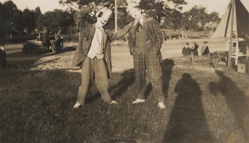 The two clowns were most likely dressed for a matinee circus performance and are standing on a grassy area, probably behind the circus performance area. The donor of these images, Melba Ryan, remembers: 'Doris Holden would have said something like 'Do a pose' and took the photograph.' Doris' shadow is in the foreground. The location is unknown.
