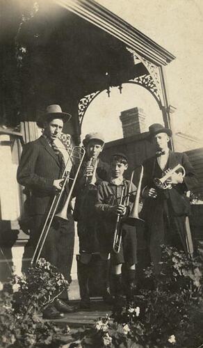 Two men and two boys with brass instruments on the verandah of a suburban house. All are wearing hats and the boys are wearing shorts and jackets. The men are wearing trousers and jackets. A garden is in the foreground, and through the iron lacework archway of the verandah at right is the chimney of a neighbouring house.