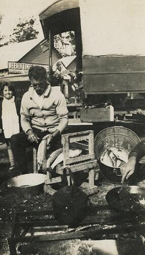 A man cleaning fish, in front of a cooking fire, with a circus caravan behind him and a little girl standing next to him. This photograph shows Adolphus Holden of Holden Brothers Circus, circa 1934. He is cleaning fish, and his granddaughter Melba Holden is standing behind him to the left, aged about 7. According to the family, her mother Doris would say 'Come on, be in the photo!' Adolphus' wife 'Nan' (Florence) is visible, cooking with a frying pan at the left. The cast iron 'stove' of bars over the fire was an improvement on cooking straight on the fire. The family remembers the Holdens were great fishermen. 'Once the tent was up, if they were at a beach town they would go fishing and catch fish whenever they could.' The location is unknown.